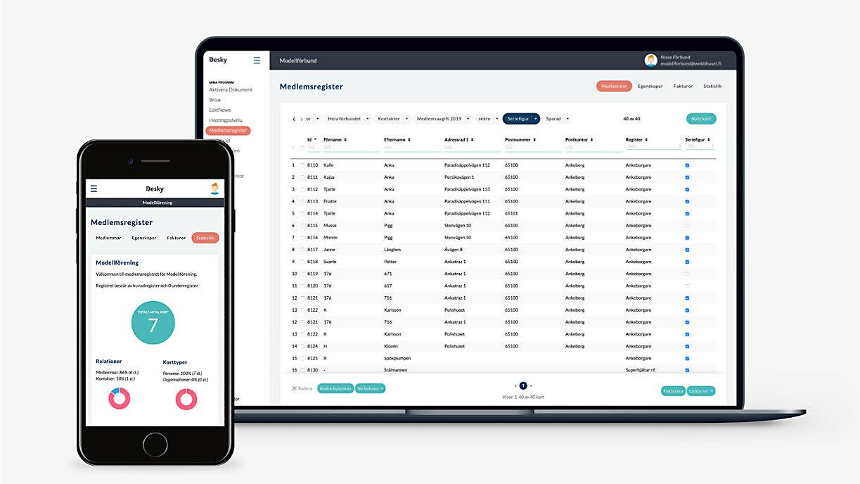 I Desky samlas dokument, filer, medlemmar, bidragshantering, katalogisering och mer i en helhet som är byggd för non-profit sektorn och lagrad på servrar i Finland.